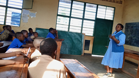David and Fidele, members of SOE and SR Rwanda facilitating a climate awareness session at Mbare Primary school located in Shyogwe Sector, Muhanga District in the Southern province of Rwanda, September 2023